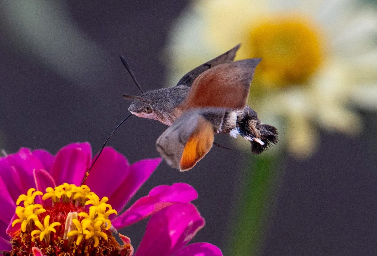 The hummingbird hawk-moth is a species of hawk moth found across temperate regions of Eurasia. The species is named for its similarity to hummingbirds, as they feed on the nectar of tube-shaped flowers using their long proboscis while hovering in the air; this resemblance is an example of convergent evolution.